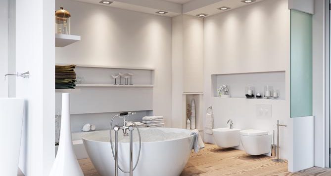 Faites construire ou construisez un faux plafond en plâtre et installez-y l’éclairage de votre salle de bain. N’oubliez pas les spots à installer dans les coins nécessitant une luminosité intense, notamment autour du miroir.
